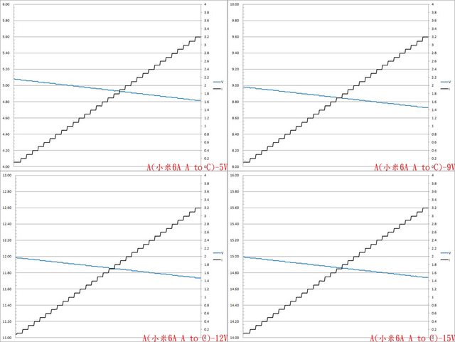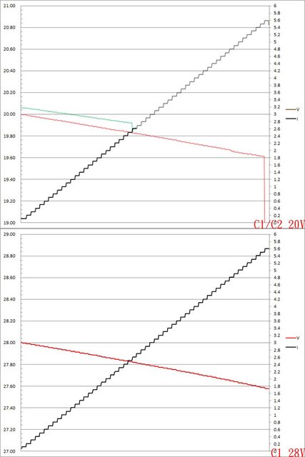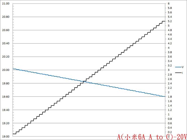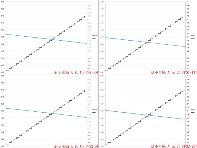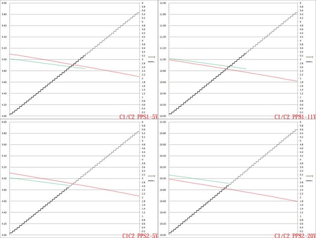 二組PPS檔5V電流增加時輸出電壓下降,電流超過3.2A截止。第二組PPS檔20V電流增加時