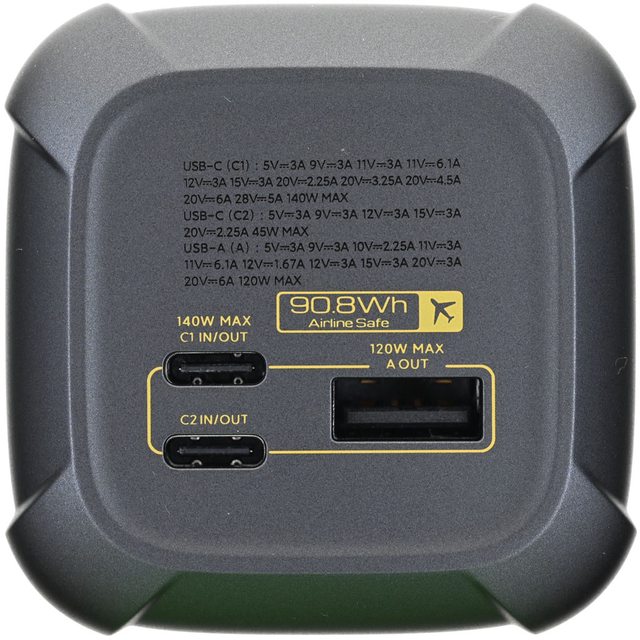 ▼行動電源頂部有輸出規格、90.8Wh Airline Safe可登機圖示、2個USB-C輸入/輸出埠、