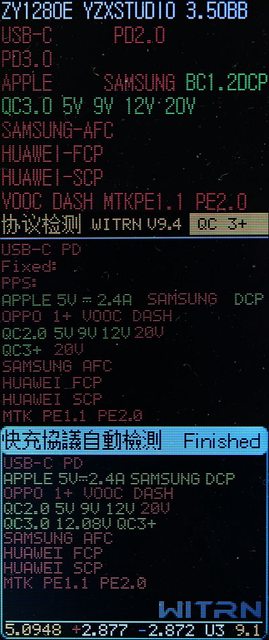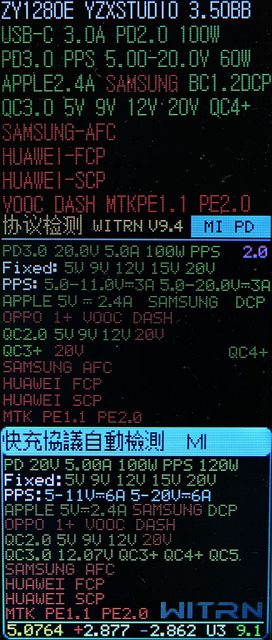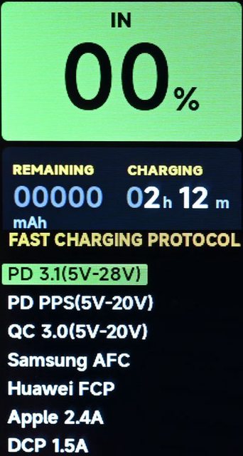時間(h/m)。這時按下按鈕可切換螢幕顯示充電快充協議,綠色光棒為使用中的協議
