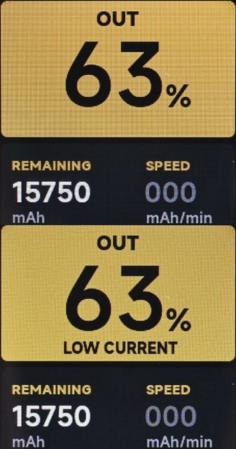 mAh/min。這時快速按兩下按鈕會啟動小電流放電模式,百分比下會多出LOW CURRENT字樣