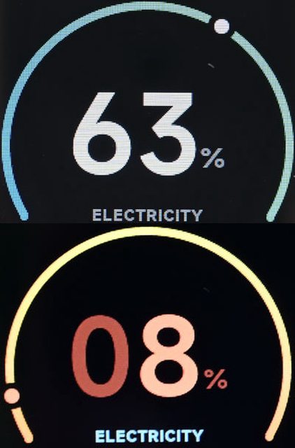 量過低時百分比及環狀儀表會變色。螢幕點亮下若無任何操作,30秒後亮度會變暗,亮度