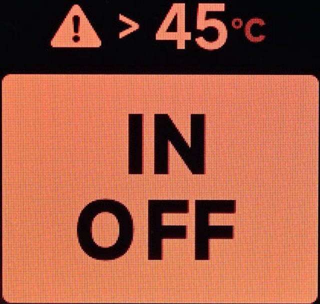▼若發生異常,會顯示異常狀態及紅底黑字OUT OFF(輸出停止)/IN OFF(充電停止)字樣。
