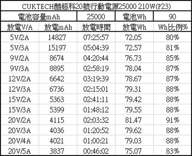過規格標示的額定電容量13500mAh,可用Wh比例最高91%(20V/2A),最低80%(5V/2A)