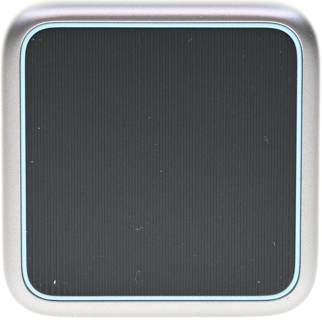 ▼行動電源正面有透明視窗,靠近頂部有彩色螢幕,螢幕下方有按鍵,按鍵下方有水藍色