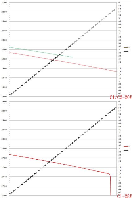 ▼C1(紅)/C2(綠)埠的固定檔20V電流增加時輸出電壓下降,C1電流超過5.6A截止;C2電流