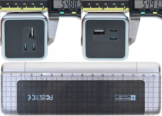 ▼行動電源頂部有2個USB-C輸入/輸出埠、1個USB-A輸出埠,IN1/OUT1連接器內部為水藍