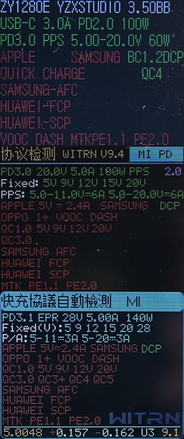 支援PD3.1 EPR 28V/5A 140W。A埠支援QC/AFC/FCP協議,支援小電流輸出模式