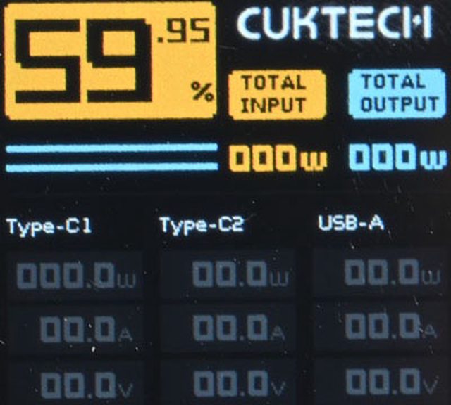 TOTAL OUTPUT(總輸出)功率。下方C1/C2/A埠的功率/電流/電壓數字為0並反灰顯示。未輸