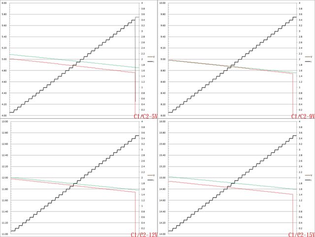 截止;C2電流超過3.5A截止。固定檔12V電流增加時輸出電壓下降,C1電流超過3.4A大幅