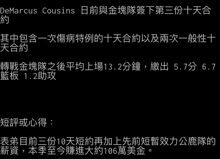 推 s678902003 : 合約簽一個月,但實際只打10天內的4場主場吧...? 12/20 10:08