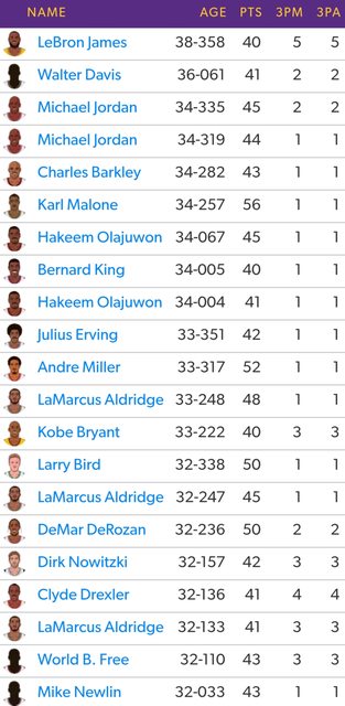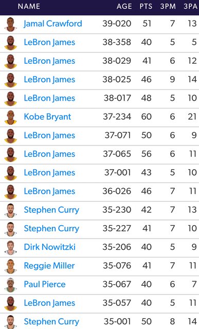 如果是看最老單場40分且5顆三分球,目前是J尻的39歲: http://i.imgur.com/Byt7XyE.jpg
