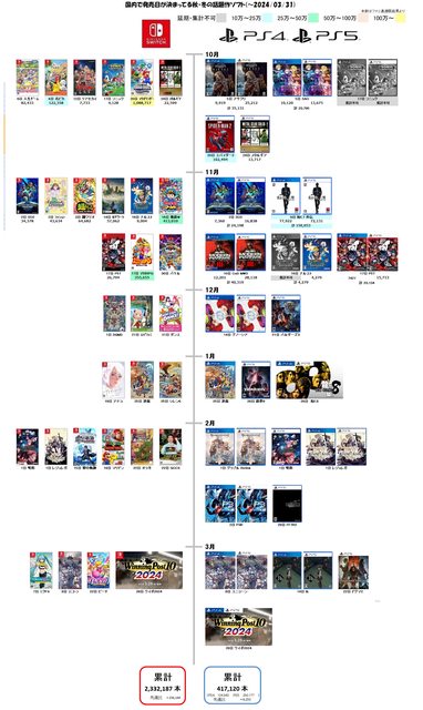 第 2 名是累計銷量突破 100 萬套的《超級瑪利歐兄弟 驚奇》,第 3 名是《超級瑪