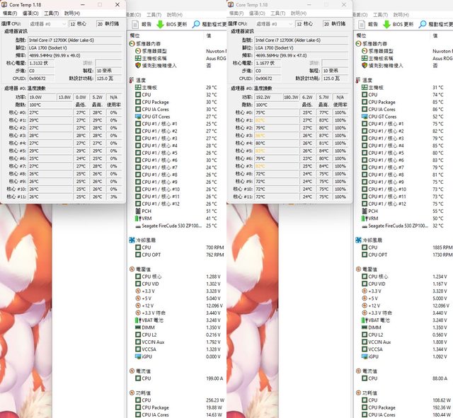 ▼待機(左)及高負載(右)的CORE TEMP及AIDA64感測器畫面