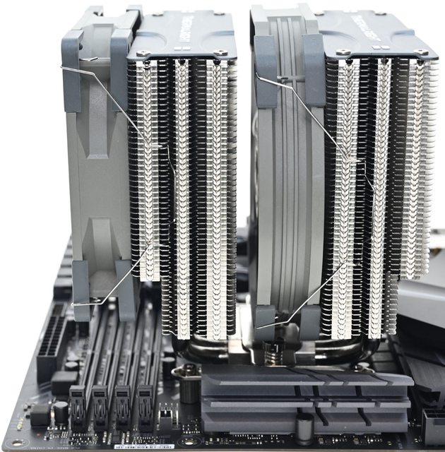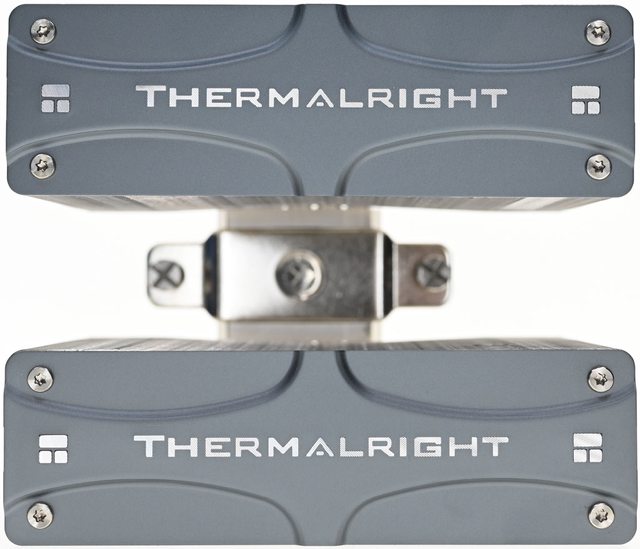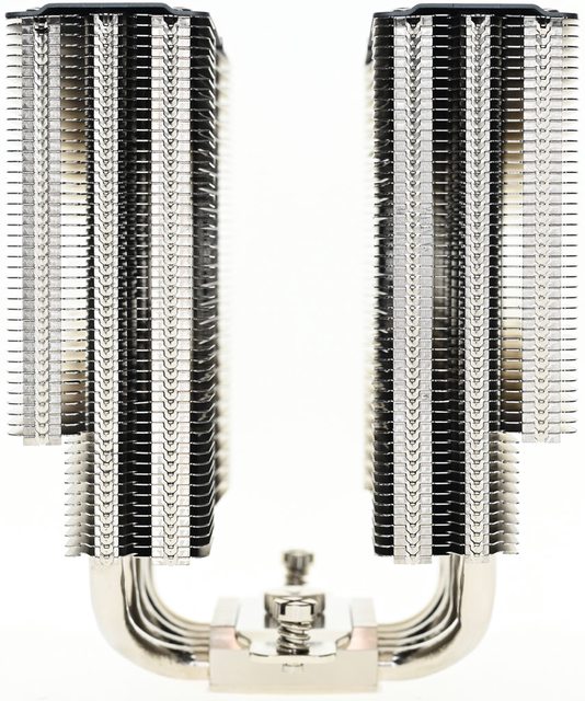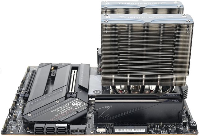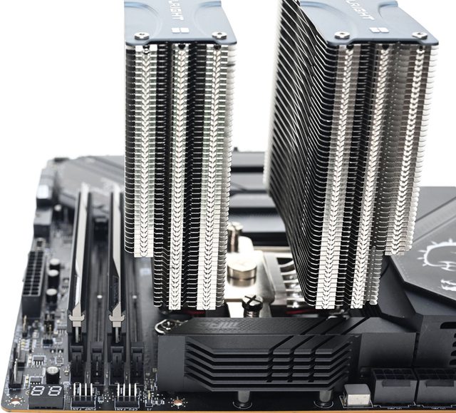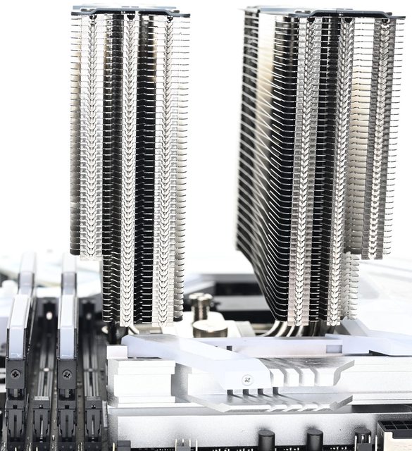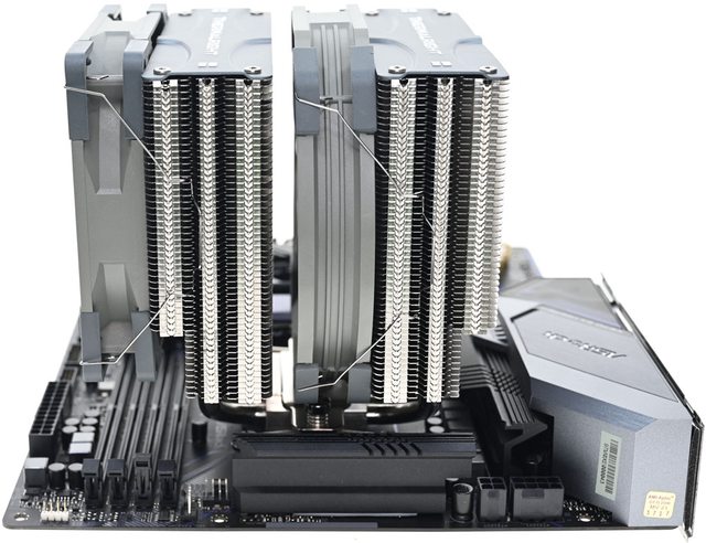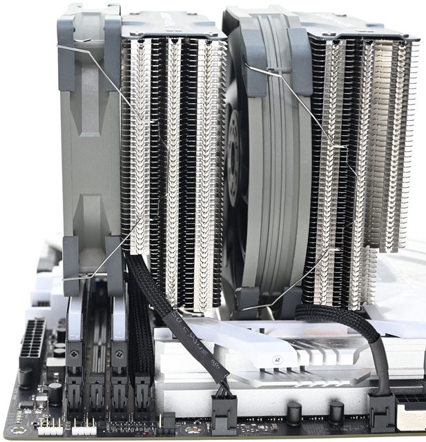 ▼從側面看雙塔結構,前塔及後塔下方12片散熱鰭片縮小,提供記憶體閃避空間,壓板中