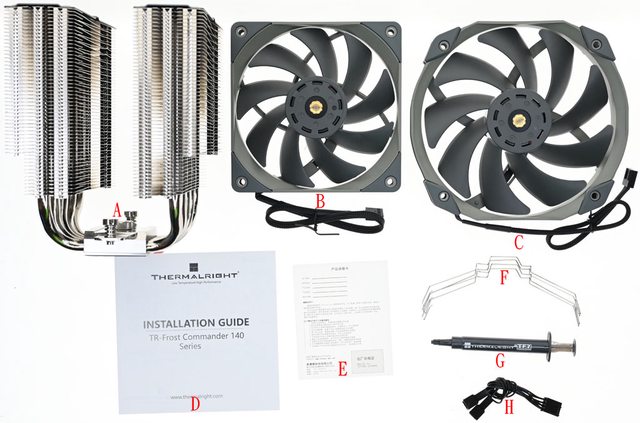 證卡(E)、風扇固定線扣(F)、TF-7散熱膏(G)、1對2風扇分接線(H)