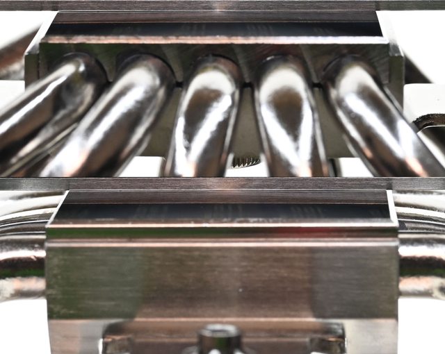 片裁切處理,表面鍍鎳的銅製處理器接觸面和5支直徑8mm無重力熱導管之間採用焊接方式