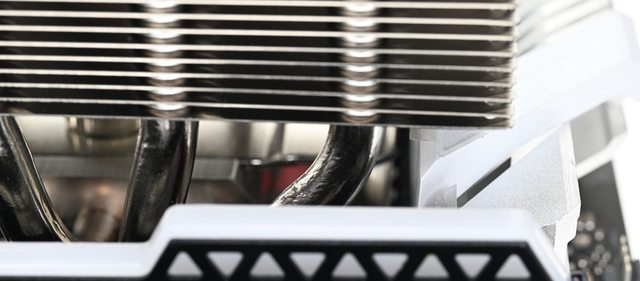 ▼散熱器本體採雙塔設計,底座兩邊各伸出5支直徑8mm無重力熱導管,並在熱導管上安裝