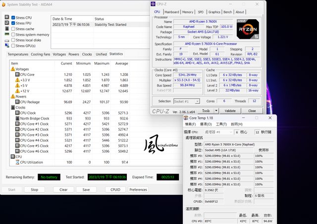 7600X預設值燒機,電壓顯示1.221V,功率94.6W,