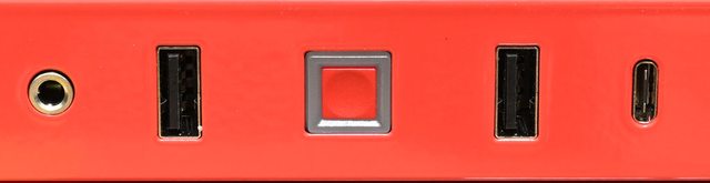▼位於機殼正面下方的橫置式I/O埠、按鈕與指示燈,由左至右分別是4極耳機麥克風