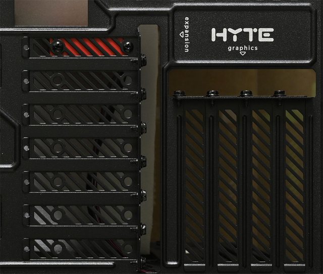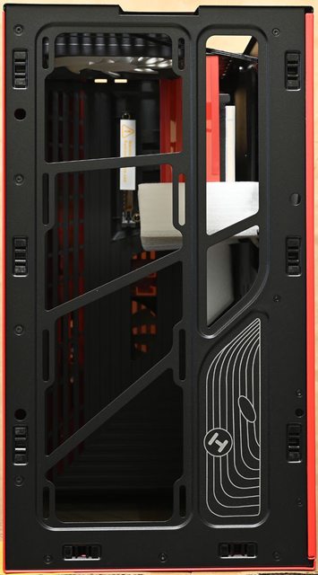 質顯示卡專用直立延長線已預先安裝在內部,底板最上方有1個長條形穿線開口,底板鏤