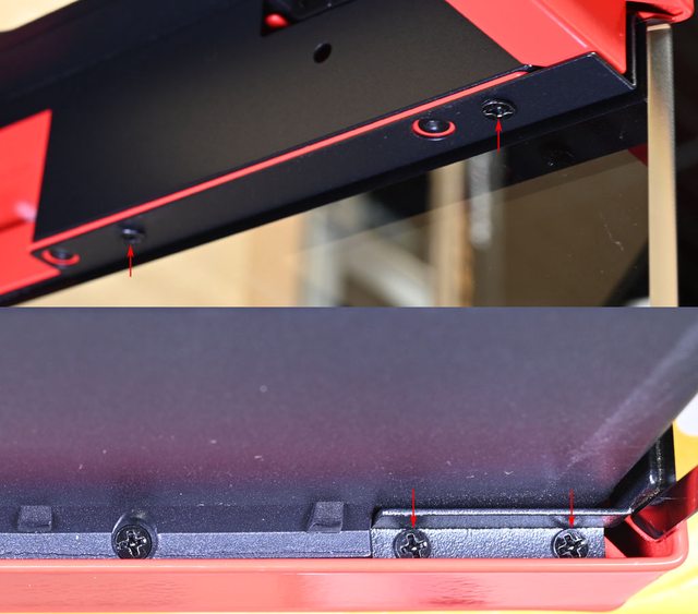 ▼正面強化玻璃面板上方及下方還有4個螺絲固定(紅色箭頭),6個螺絲拆卸後即可取下正