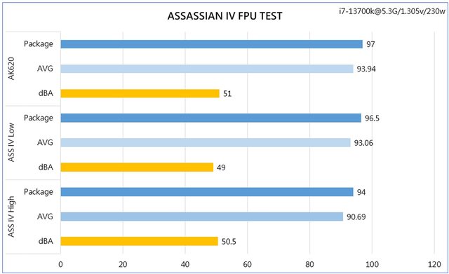 測試分為AK620、阿薩辛4 靜音模式、阿薩辛4 性能模式等3組,每組各測試2次單烤FPU