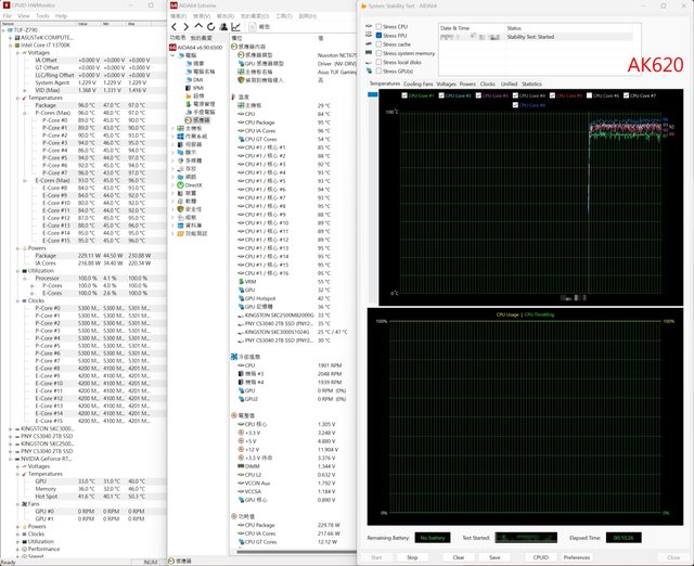 對照組為九州的AK620雙塔散熱器,並且模擬成阿薩辛4的雙後抽風扇配置。