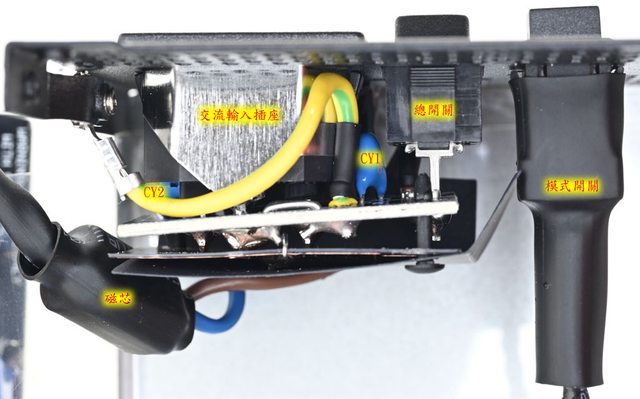 ○交流輸入插座及總開關後方小電路板背面覆蓋隔板。磁芯/交流電源線/模式開關本體/