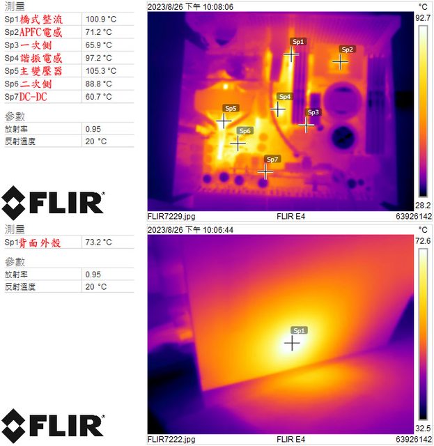 ▼電源供應器滿載輸出下內部(上圖)及背面外殼(下圖)的紅外線熱影像圖(附註:安裝位