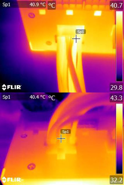 ▼單條PCIE 6+2P連續輸出21A(252W)10分鐘後的電源端模組化接頭紅外線熱影像圖(附註