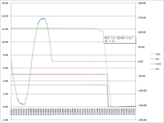 ○綜合全負載輸出狀態切斷AC輸入模擬電力中斷,12V於21ms降至11.34V