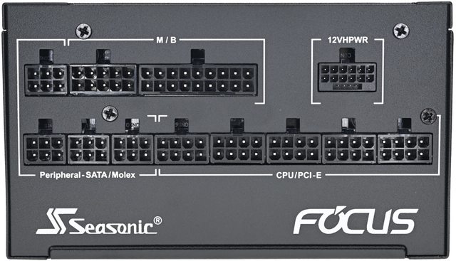 ▼模組化線組輸出插座有名稱標示,左下方有Seasonic商標,右下方有FOCUS字樣
