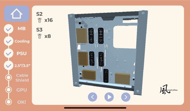 Build頁面將零組件安裝進機殼,左方依每樣硬體安裝順序,右方為安裝時固定所需的螺