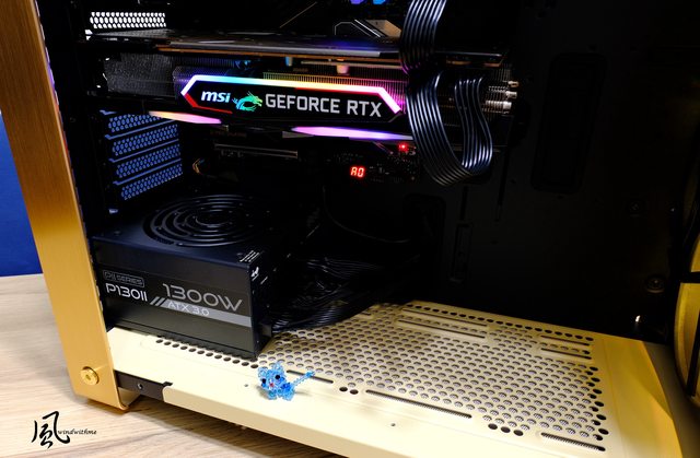 組裝完成後外觀一覽,燈號顯示僅用機殼內附4顆風扇,並安裝手邊長度最高的顯卡328mm