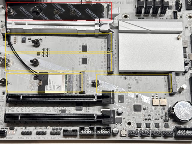 PRO X具備5個PCI-E M.2 SSD插槽,第一個插槽為CPU直連,底部具備額外導熱墊,支援