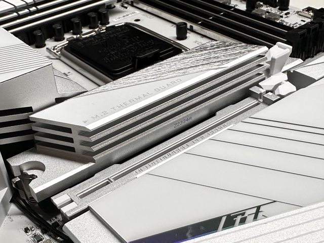 第一槽M.2配置與供電區域相同風格的散熱片,一樣為多層切削的金屬,此插槽支援