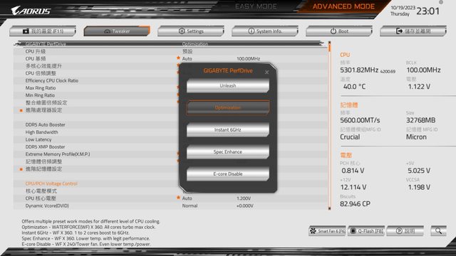因為這次使用360mm AIO散熱器,就直接選擇Instant 6GHz選項,讓其中1~2個P核心能超
