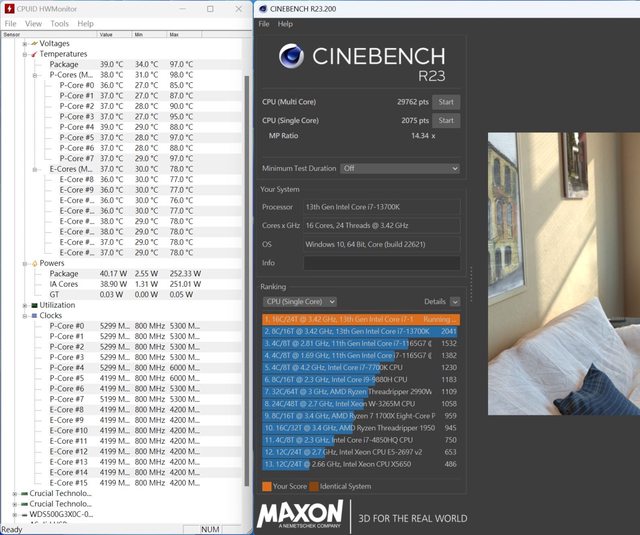 跑R23時各核心多數時間還是維持在5.3Ghz的預設Boost頻率。