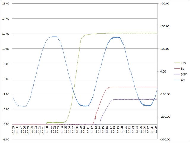 ○電源啟動至綜合全負載輸出狀態,12V上升時間16ms,5V上升時間6ms,3.3V上升時間