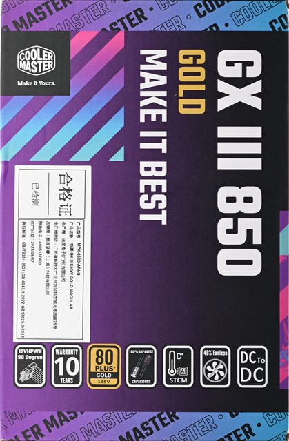 ▼外盒左側面有Cooler Master商標、GX III 850 GOLD名稱、MAKE IT BEST字樣、80PLUS