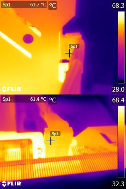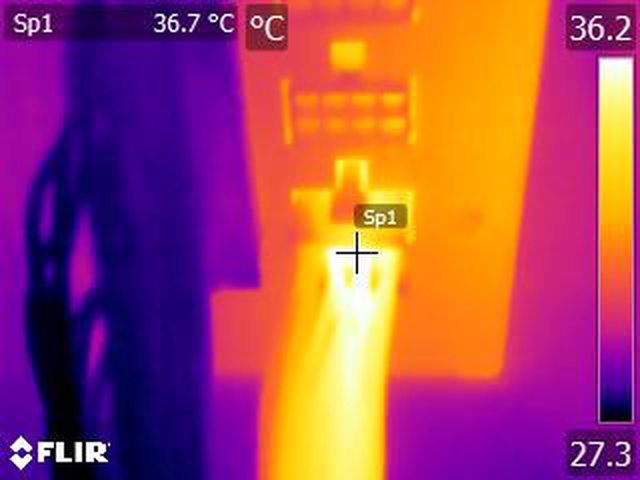 ▼執行FURMARK 30分鐘後電源端插頭的紅外線熱影像圖(附註:安裝位置環境溫度會影響