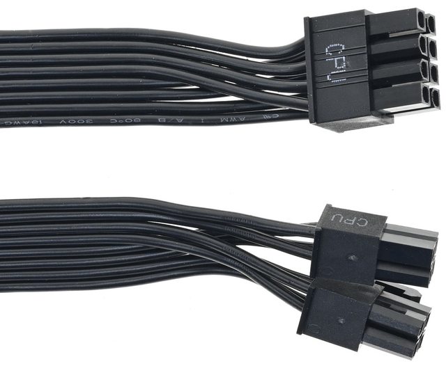 ▼2條處理器電源黑色帶狀模組化線路,提供1個EPS 4+4P接頭及1個EPS 8P接頭,18AWG線