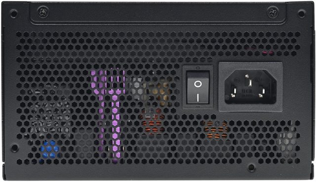 ▼本體出風口處設有交流輸入插座及電源總開關,透過網孔可看到內部紫色散熱片