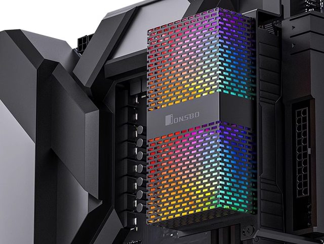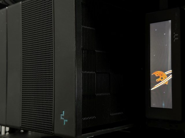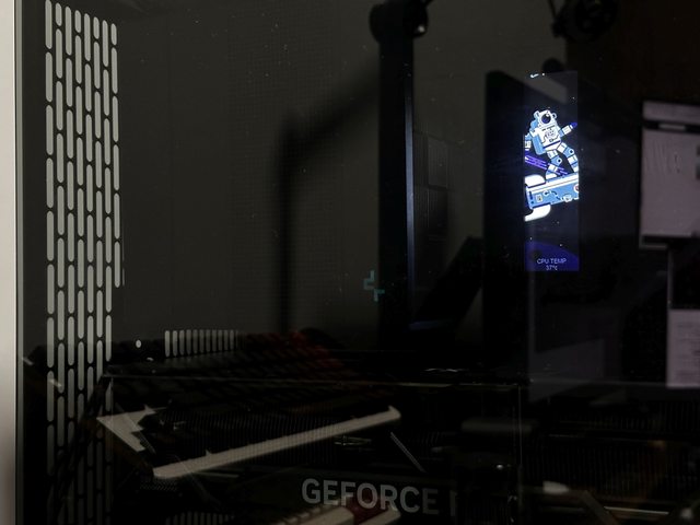 雖然風扇支架面積大於螢幕,外觀上可能稍微差一點,但在黑色機殼內,將深黑的玻璃側