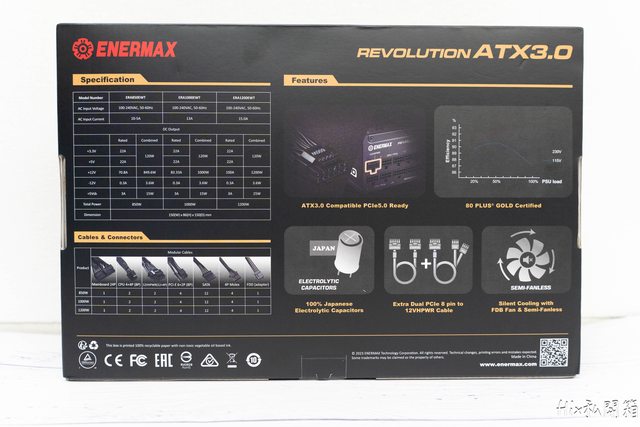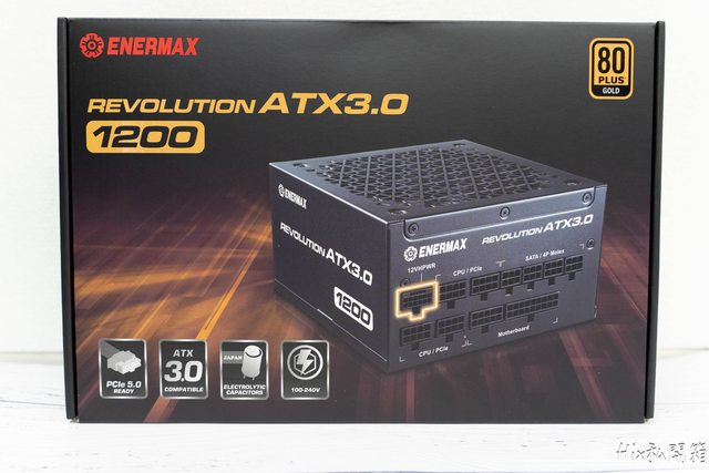 盒裝正面標明PCIE5.0、ATX3.0、全日系電容以及廣域電壓(100-240V)相容
