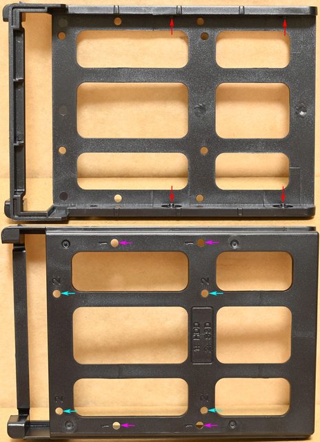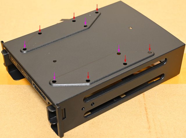 ▼固定架頂部有3.5吋硬碟(紅色箭頭)及2.5吋SSD(紫色箭頭)固定孔