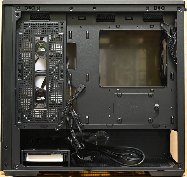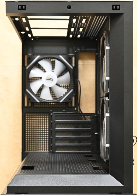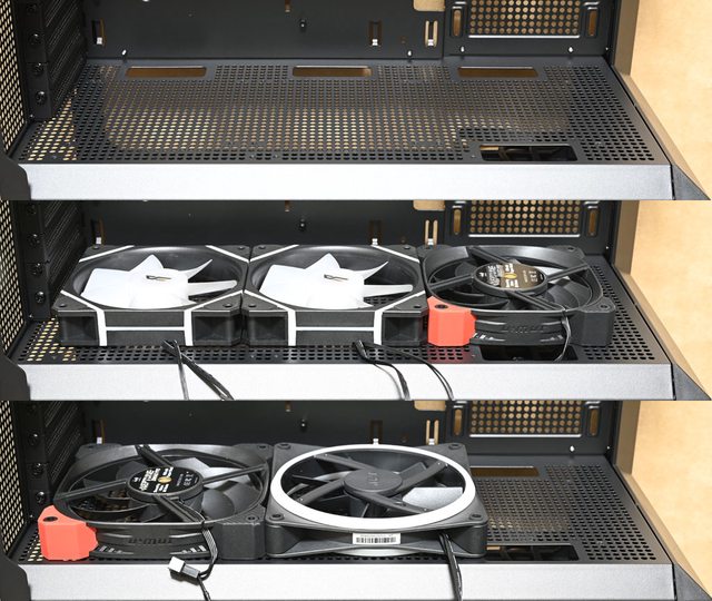 ○右側前方/頂部/電源艙頂部/後方均有安裝風扇的位置,提供最多9個120mm風扇安裝空