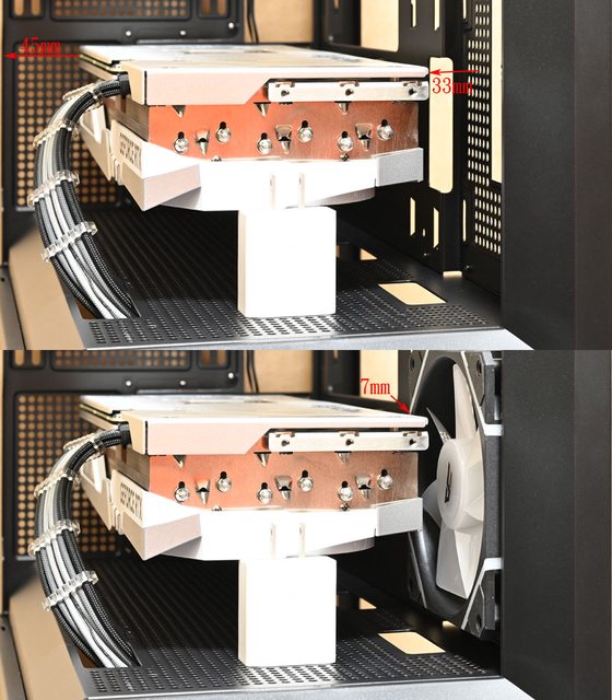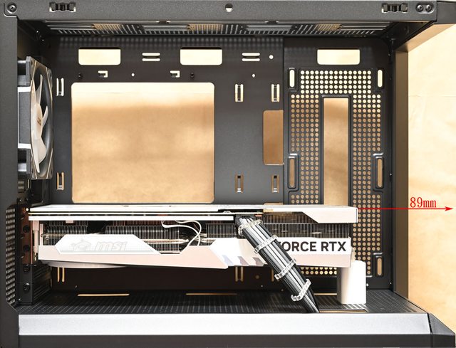 機殼左側面板距離45mm,顯示卡右側與機殼右側前方風扇安裝位置距離33mm(無風扇