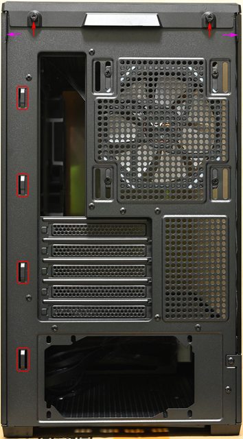 ▼機殼後方,最上面有打開左/右側板的凸出把手(紫色箭頭)及固定頂部蓋板的手轉螺絲(
