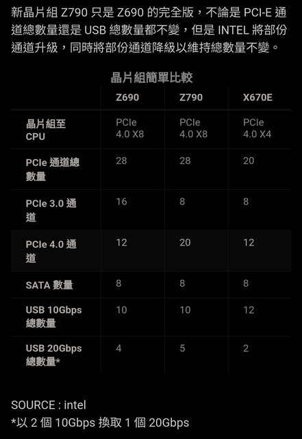 新晶片組 Z790 只是 Z690 的完全版,不論是 PCI-E 通道總數量還是 USB 總數量都不變,